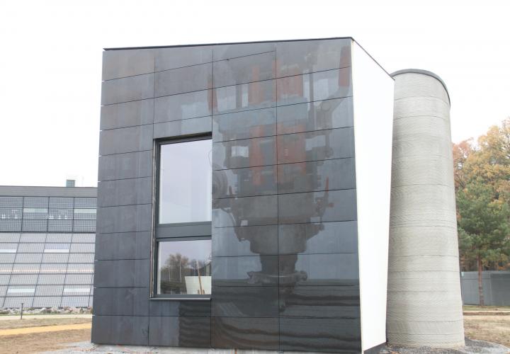 Primeur: op Kamp C werd het 3D-betongeprint huis afgewerkt met de nieuwste generatie fotovoltaïsche gevelbekleding.